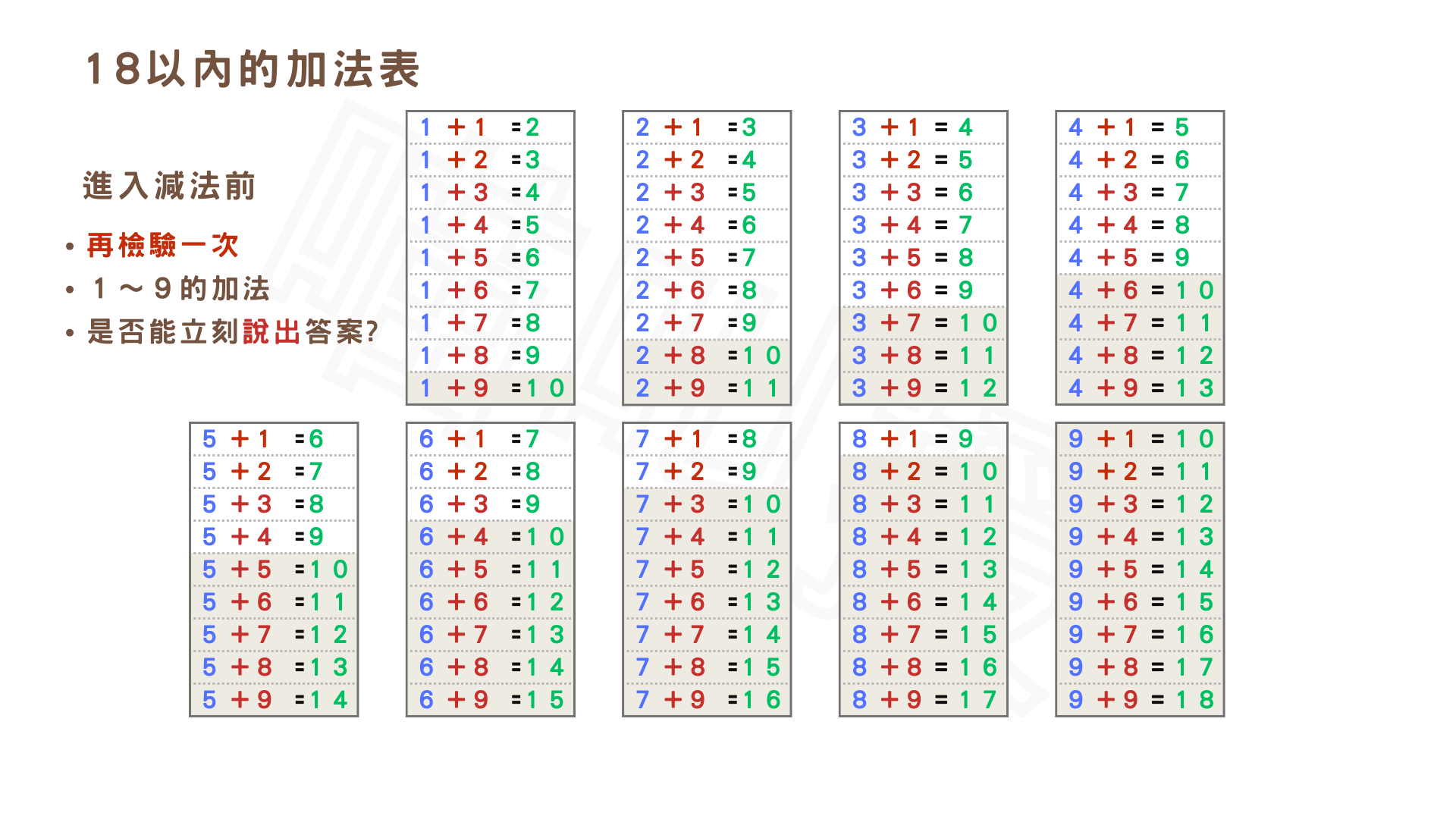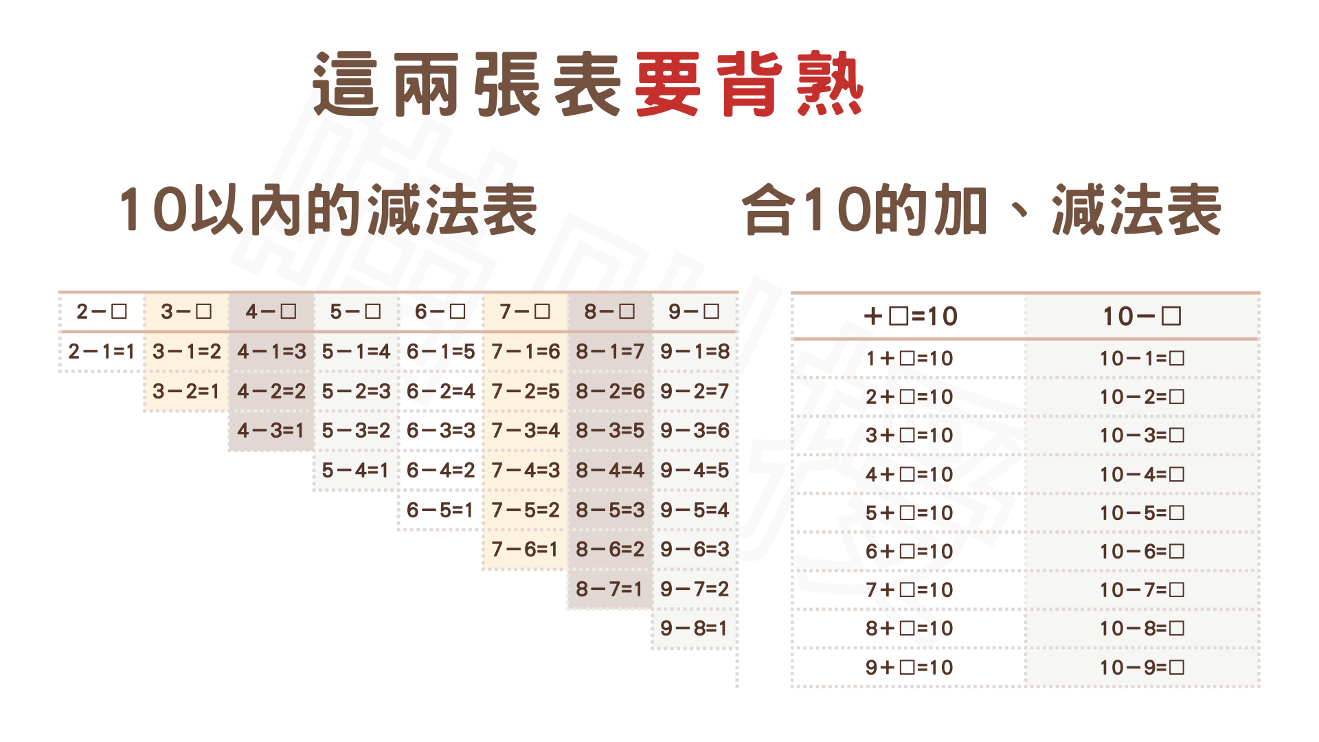 10以內減法表,合10加減法表,18以內加法表